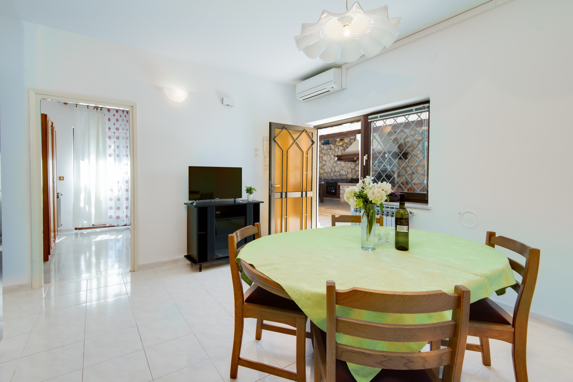 Wohn-Esszimmer und Küche sind eine Einheit; Esstisch und Sitzgelegenheiten für alle Personen; Zimmer gefliest