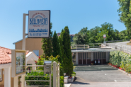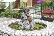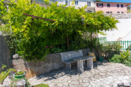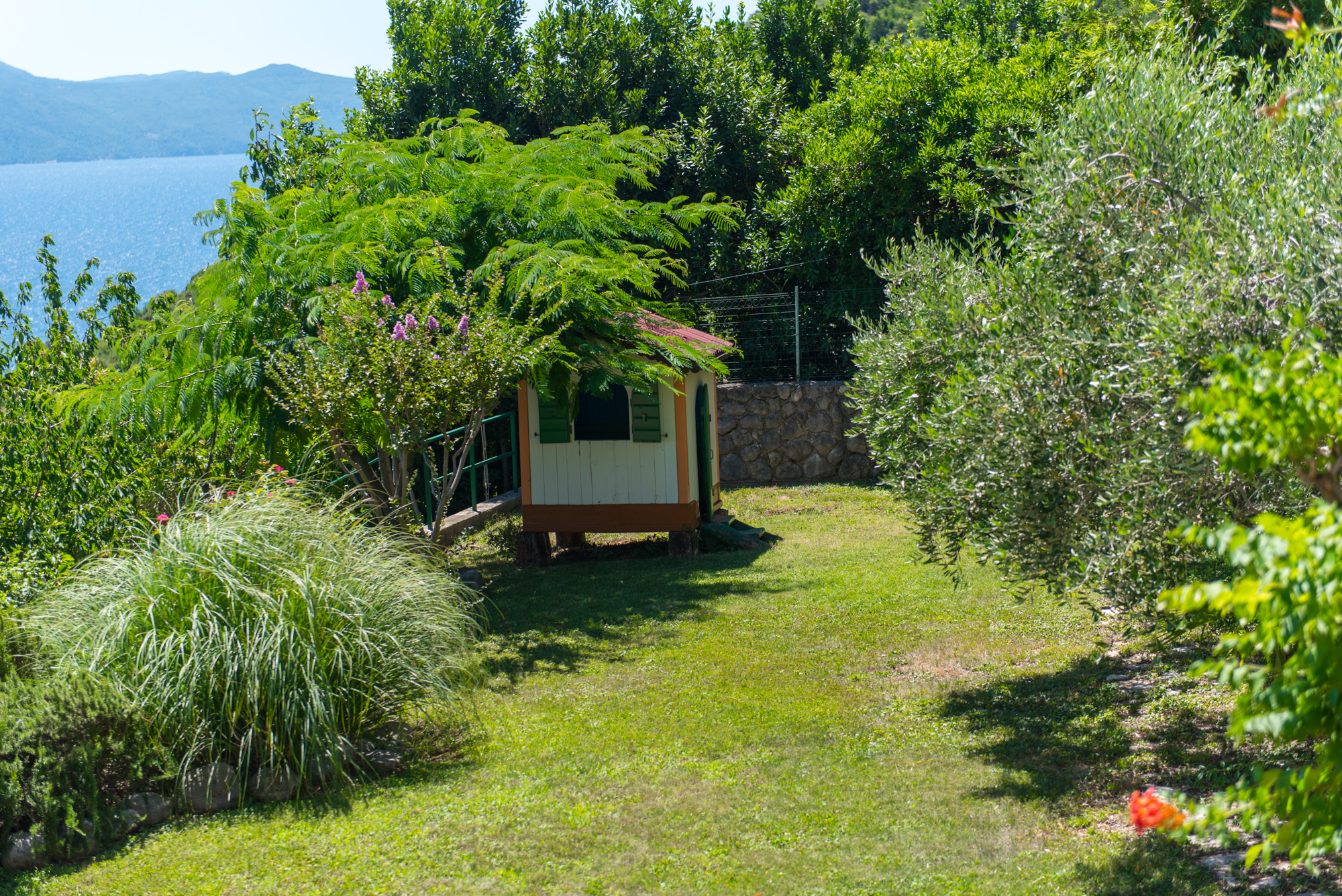 parking u dvorištu objekta, uređene zelene površine s autohtonim biljem (lavanda, ružmarin, oleandri, hortenzije, ruže, travnjak), fontana, ljuljačka za djecu, dječja kućica