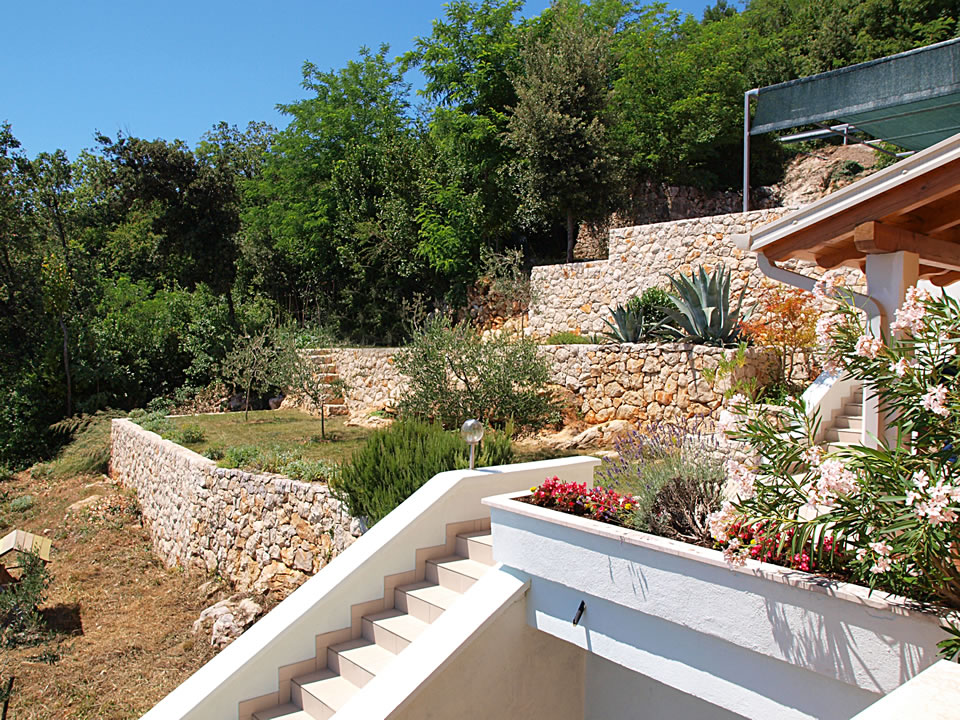 parking u dvorištu objekta, uređene zelene površine s autohtonim biljem (masline, lavanda, kadulja, ružmarin, agave, oleandri, hortenzije, majčina dušica, travnjak)